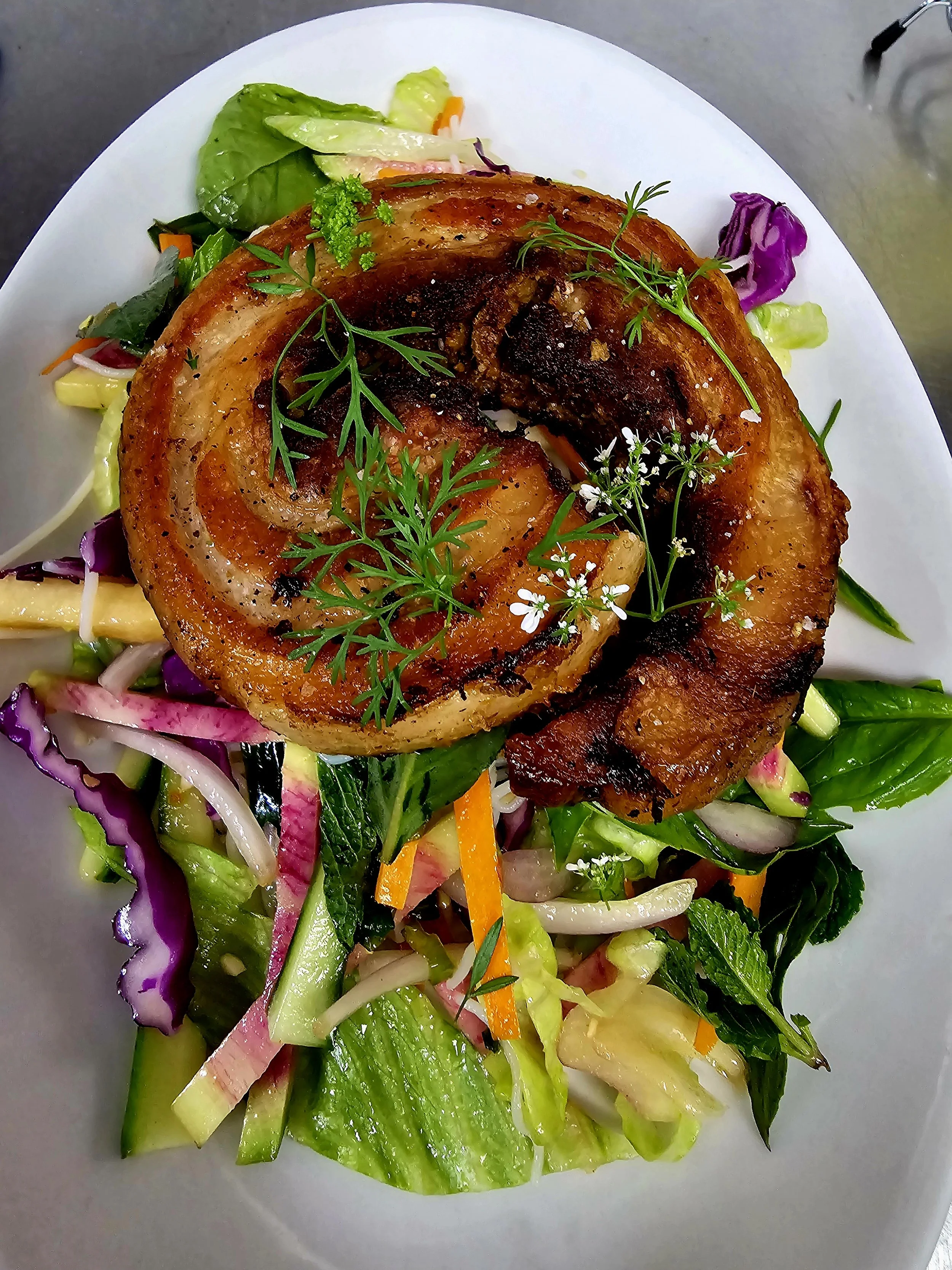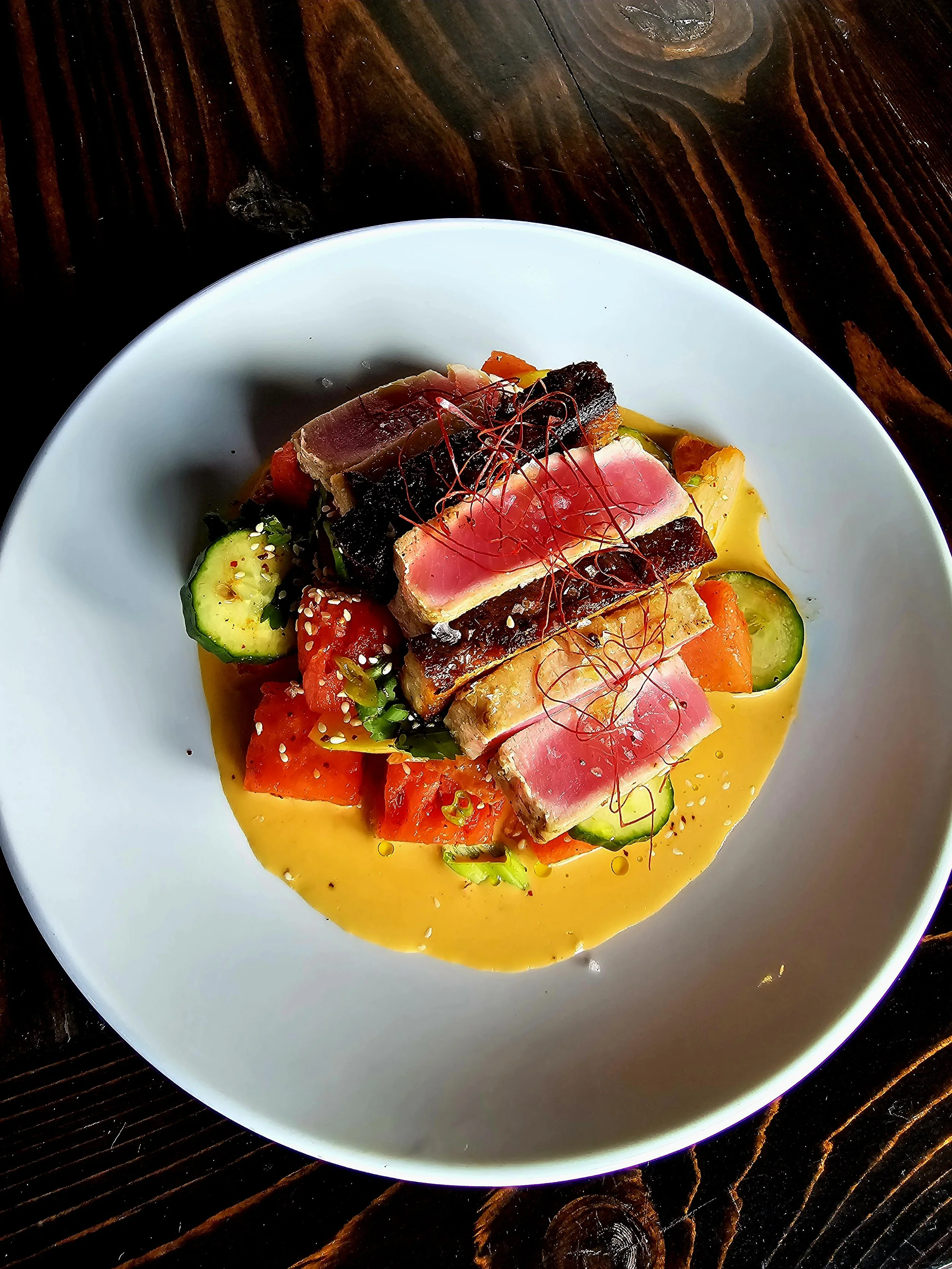 A classic Beef Wellington preparation of beef tenderloin, mushroom duxelles, & prosciutto wrapped in puff pastry. Served with seasonal pairings for $60 per serving. Wellington Wednesday is the last Wednesday of every month and reservation only. Please contact us for availability and reservations.
